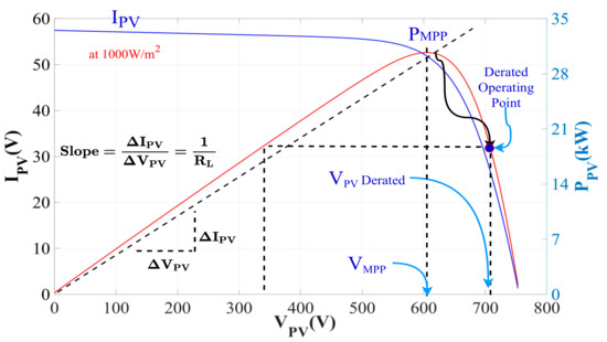 Figure 4 shows the PV power curve during the GC and SA modes. In the SA mode, the PV power extracted from InC MPPT is drastically reduced depending on the . The PV voltage and current at MPP ( and ) also change to derated and derated , respectively, during derated operation.
