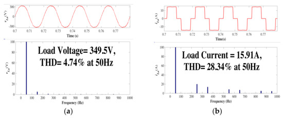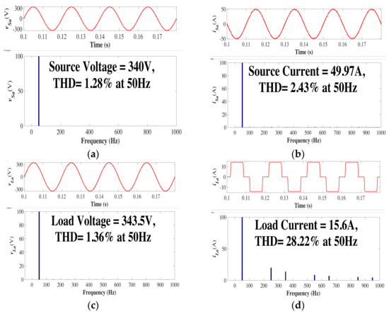 Figure 11a,b shows the THD analysis of the load side during the SA mode. The SRF-based voltage control also performed the harmonics elimination, and the THD level was maintained below 5% as per the IEEE 519 standard, whereas the THD levels were very high due to the non-linearity of the load attached to the PCC.