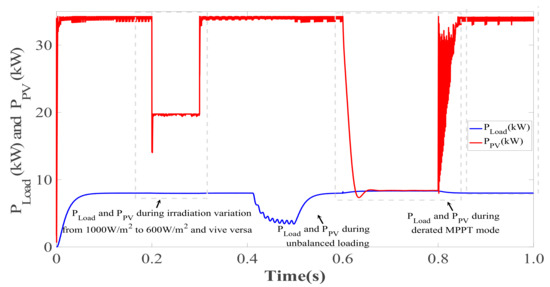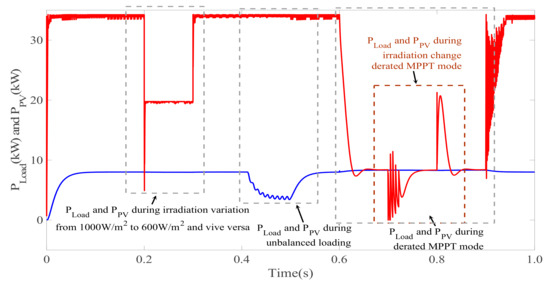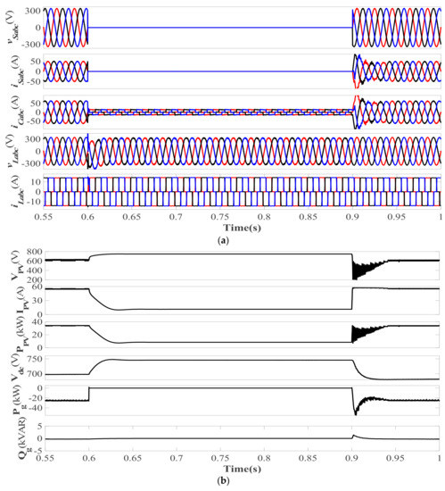 Figure 7a,b shows the irradiation variation analysis of the system during the GC mode, when the solar insolation level was reduced from 1000 W/m2 to 600 W/m2 and vice versa. Figure 7a shows that the grid voltage and currents and in phase opposition as excess PV power was provided to the grid through the PCC. As the irradiation level was reduced, was also reduced, resulting in the reduced magnitude of as well. The VSC current magnitude was also reduced as the VSC handled less power. The load current was distorted due to the non-linear load attached to the PCC. The magnitude of load voltage remained the same as grid voltage during the GC mode. Figure 7b shows that the PV current and power and , respectively) reduces with solar irradiation levels. The was maintained at the desired level. Moreover, the reactive power exchange with the grid remained almost zero as VSC delivered the required to the load.