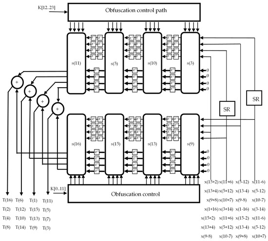 As it can be observed from Table 3, the proposed solution has a low hardware complexity while maintaining a high throughput. It can also be seen that our solution has a double throughput as compared with [36,41] and allows for a reduced complexity of the hardware core presented in Figure 2 since it requires only adders for its hardware implementation. Moreover, the critical computation path can be further reduced by using two-level pipelining. It requires two multipliers in the post-processing stage. Additionally, our solution allows an efficient incorporation of the obfuscation technique that is not presented in the other solutions.
