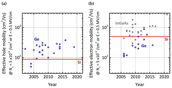 Silicon (Si) complementary metal-oxide-semiconductor (CMOS) technologies have been continuously advancing with new materials and technologies, such as high-k gate dielectrics, metal gates and strain, to overcome the physical scaling limit. Furthermore, the channel material has been replaced recently in a p-channel field effect transistor (p-FET) by silicon–germanium (SiGe), which has a smaller effective hole mass [1]. From the viewpoint of channel materials in Si CMOS technologies, since germanium (Ge) has smaller effective masses for both the electrons and hole than Si and SiGe [2] and belongs to the group XIV elements, which has a high process compatibility with Si, meaning it is an attractive candidate for an alternative channel material for further advanced nodes. Although Ge oxide has some disadvantages, such as thermodynamic instability and water solubility [3,4,5,6,7], many studies have been performed to realize high-performance Ge FETs expected from the potential of bulk Ge properties. At first, Chui [8] and Shang [9] demonstrated a high-performance Ge p-FET, which is much superior to that of Si, with the nitride passivation of the gate stack in 2002. Thereafter, by advancing the understanding of the Ge gate stack design, both the Ge n- and p-FET performance have been greatly improved [10,11,12,13,14,15,16,17,18,19,20,21,22,23]. The progress of the effective mobility improvement in inverted FET channels over the last 20 years is summarized in Figure 1. With regard to the equivalent oxide thickness (EOT) scaling in the Ge gate stack, feasibility down to approximately 0.5 nm has been demonstrated [24,25]. Additionally, Ge FETs with nanowire or gate-all-around channel structures that assume further scaling have been reported [26,27]. In the future, for designing practical Ge FETs, it is also important to consider the disadvantage of a higher dielectric constant of Ge in terms of drain-induced barrier lowering and the advantage of easy planarization by thermal annealing in various atmospheres [28,29,30] in terms of structural dispersion.