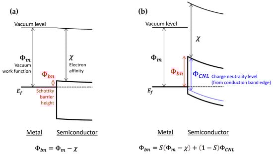 where and are vacuum work functions of the metal and electron affinity of the semiconductor, respectively. This case is also called the Schottky limit and decreases (increased) as much as the decrease (increase) of (Figure 2a).