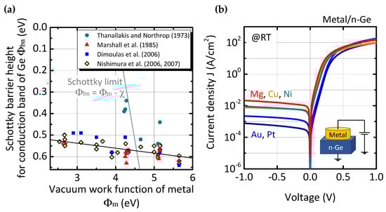 Next, we discuss the relationship between the vacuum work function of the metal and Schottky barrier height at the metal/Ge interface. The systematic trend was first reported by Thanailakis in 1973 [35]. After that, analyses focusing on FLP were reported by Marshall [36], Dimoulas [37] and Nishimura [38,39]. The relationships between the Schottky barrier height at metal/n-Ge(100) and the vacuum work function of metal are summarized in Figure 3a. The vacuum work function of metals is found in references [40,41]. In three recent reports, the Fermi level at the metal/Ge(100) interface is close to the valence band edge of Ge and is little dependent on the vacuum work function of the metal and a large Schottky barrier comparable to the band gap of Ge is formed on n-Ge. The FLP strength of the parameter at the metal/Ge(100) interface is evaluated from the slope in Figure 2a to be 0.02–0.05, which is much less than that at the typical metal/Si interface (~0.3) [34]. The FLP energy level of at the interface is estimated from the intersection of the fitted data line with the Schottky limit line in Figure 2a to be 0.49–0.58 eV. Both the parameter and are almost the same among the results in recent studies [36,37,38,39].