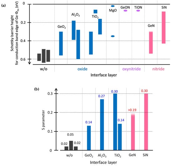 Furthermore, the correlation between the Schottky barrier height at metal/ultrathin GeO2/Ge exhibits an obvious vacuum work function dependence, as shown in Figure 6. The vacuum work function dependence of the Schottky barrier height indicates that the ultrathin insulator surely has a role in alleviating the FLP and that the Schottky–ohmic reversal of Al/ultrathin GeO2/Ge diodes shown in Figure 4a is not caused only by the pinning level shift. As summarized in Figure 7a,b, Schottky barrier height modulation and FLP alleviation have been observed by Al2O3 [66,67], TiO2 [68,69,70], MgO [71,72], GeON [73], TiON [74], GeN [75] and SiN [76], in addition to GeO2 [65,68]. These experimental results imply that the FLP alleviation by inserting an ultrathin insulator into the metal/Ge interface is attributed to the insulating property of the interface layer or interface passivation by the oxygen or nitrogen included in the interface layer.