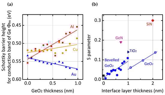 Figure 8a shows the Schottky barrier height at the metal (Al, Cu and Au)/GeO2/Ge interface as a function of GeO2 thickness. The Schottky barrier heights in the figure are evaluated from the saturation current density in I-V characteristics measured at room temperature and the Richardson constant, without any correction for the tunnel resistance [68]. However, it is obvious that the Schottky barrier height for the conduction band edge of Ge at the Al (low work function metal) and Au (high work function metal) contact interfaces gradually decreased and increased, respectively, with increasing GeO2 thickness. Although it is difficult to exactly discuss the FLP strength from the few kinds of metals with different vacuum work functions, the parameter evaluated from the three kinds of metal gradually increases with GeO2 thickness, as shown in Figure 8b. Gradual FLP weakening with an increasing interface layer thickness is also observed at the metal/Si interface [68]. Although, Schottky barrier height modulation at the metal/Si interface by an ultrathin insulator as a concept of MIGS suppression had been proposed by Connelly [77] before the reports of these studies, which are focused on Ge, and these results suggest that the thickness effect of the insulator results in FLP alleviation and qualitatively support that MIGS is the dominant FLP mechanism both at the metal/Ge and /Si interfaces. On the other hand, here, it is assumed that MIGS and other FLP mechanisms work independently. It is, however, reported that intrinsic MIGS reduces defect formation energy based on first-principles calculations [78] and that Si bond breaking by contact with metal has been observed [79]. Therefore, to further understand FLP alleviation, more quantitative analysis, including the secondary effect of MIGS, might be necessary.