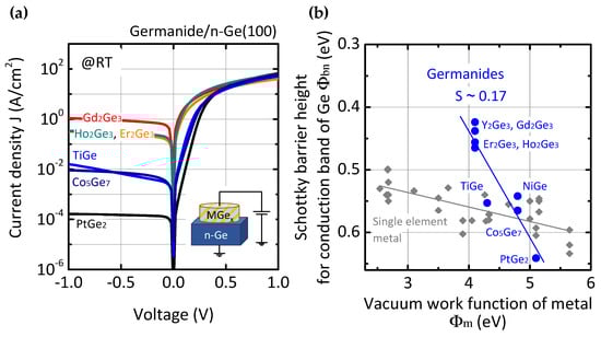 Germanide/n-Ge(100) diodes show rectified I-V characteristics (Figure 9a), but the saturation current densities seem to have a strong metal dependence compared with those of single-element metals/n-Ge diodes (shown in Figure 2b), although the swept range of the vacuum work function of germanide might be much narrower than that of single-element metals due to compound formation with Ge. The relationship between the vacuum work function of the metal and the Schottky barrier height at the metal/Ge interface is shown in Figure 9b. Here, the work function of crystallized germanide is assumed from the metal–Ge composition ratio in its crystal structure, the group electronegativity [84] and the relationship between the electronegativity and vacuum work function [85]. The FLP at the germanide/Ge interface is weaker, as expected, and the parameter for the germanide/Ge(100) interface is estimated to be 0.17, which is much larger than that for the single-element metal/Ge(100) interface. Additionally, deviation from the strong FLP trend at the single-element metal/Ge interface has also been reported at the YbGex/Ge [86], epitaxial Mn5Ge3/Ge(111) [87], epitaxial HfGe2/Ge(100) [88] and epitaxial Fe3Si/Ge(111) [89] interfaces. These results seem reasonably understandable by the weakening of MIGS, even though interface epitaxiality may sufficiently affect the band alignment in detail. Furthermore, in the case of the metal/Si interface, FLP at the silicide/Si interface is also much weaker than that at the single-element metal/Si interface [90,91]. In addition to interfacial layer insertion, a low free-electron-density metal is also effective in alleviating the FLP at the metal/Si interface, which suggests that MIGS might also describe the FLP at the metal/Si interface well.