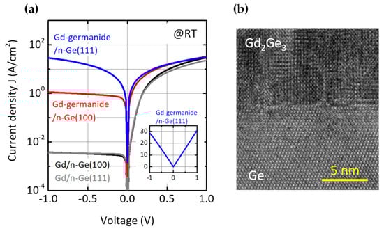 We selected GeO2, which is an oxide of the substrate, as an ultrathin interface insulator to simplify the system. Additionally, GeO2 could form an electrically better interface with Ge by the suppression of GeO desorption compared with other insulators [63,64]. Al was chosen as an electrode metal with a low vacuum work function to form low and high Schottky barrier heights for n- and p-Ge at the FLP weakened interface, respectively. Figure 5a shows typical I-V characteristics of Al/Ge(100) diodes with and without an ultrathin GeO2 layer. Surprisingly, the Al/n-Ge diode characteristics change from Schottky to ohmic by inserting a GeO2 layer, whereas the Al/p-Ge diode characteristics change from ohmic to Schottky [65]. This is definitely understandable by a shift of the Fermi level at the interface from the valence band edge of Ge to the near conduction band edge. The ultrathin GeO2 interface layer between the Al and Ge substrates is also confirmed by the cross-sectional TEM image shown in Figure 5b.