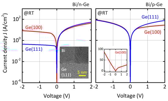 On the other hand, as previously implied, the interface fabrication process is different between the germanide/Ge and single-element metal/Ge interfaces. The germanide/Ge interface is generally formed by a thermal reaction, while the single-element metal/Ge interface is by deposition. To purely focus on the impact of the low-electron-density metal on the FLP, an example of band alignment at a low free carrier density metal/Ge interface formed by deposition is discussed. Bismuth (Bi) is a famous semimetal and its carrier density is approximately 1017/cm3, which is much less than that of common single-element metals [95]. Bi can be thermally evaporated in a vacuum chamber in the same manner as other single-element metals. There is no choice to pick up various semimetals with different vacuum work functions, such as single-element metals, but the vacuum work function of Bi is fortunately 4.22 eV [40]. It is energetically far from the FLP energy level of Ge of approximately 4.6 eV from the vacuum level, so the alleviation of the strong FLP is detectable as an obvious modulation of the Schottky barrier height. Additionally, Bi cannot form a compound (germanide) with Ge [96], which means that the possibility of band alignment modulation by Bi-germanide formation can be ruled out. As shown in Figure 11, Bi/n-Ge diodes still show rectified I-V characteristics, but the off-state current density is very high compared with the single-element metal cases. Moreover, the I-V characteristics of Bi/p-Ge(100) diodes are definitely rectified. In the relationship between the vacuum work function of metal and the Schottky barrier height at the metal/Ge interface, Bi obviously deviates from the trend of strong FLP observed at the single-element metal/Ge interface and is close to the Schottky limit [97], which suggests that MIGS at the Bi/Ge interface is efficiently suppressed. The FLP-free interface is also obtained at the Bi/Si interface [97] and the FLP-free Bi/2D semiconductor interface has also been reported [98]. Furthermore, the Schottky barrier height at the Bi/Ge interface is obviously changed within 0.05 eV, depending on the surface orientation of Ge. Although the details of the surface orientation dependence have yet to be clarified, considering the polycrystallinity of Bi on the Ge substrate, the impact of Ge surface orientation on the band alignment might directly appear in this system.