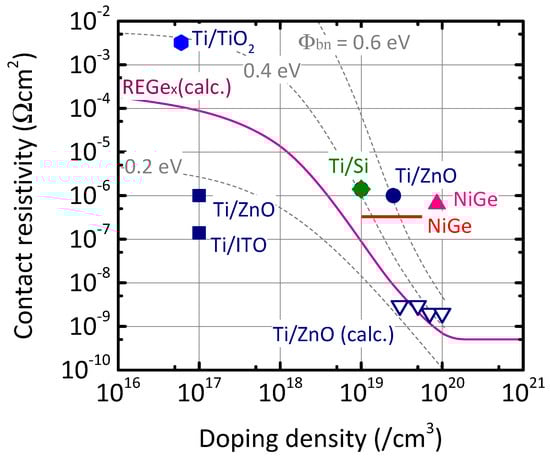 Contact resistivity at various metal/n-Ge interfaces. The calculated contact resistivities with various Schottky barrier heights are denoted in broken lines, where tunneling effective mass of electron of 0.12 m0 and relative dielectric constant of 16 is assumed. The doped ZnO and ITO looks possible to achieve ~10−9 Ωcm2 by increasing doping density. The calculated total resistivity at rare earth metal germanide (REGex)/n-Ge interface is also shown with solid line, assuming that Schottky barrier height is 0.3 eV and bulk resistivity of 5-nm-thick REGex (~5 × 10−10 Ωcm2). Data from refs. [108,110,111,112,113,116,117].
