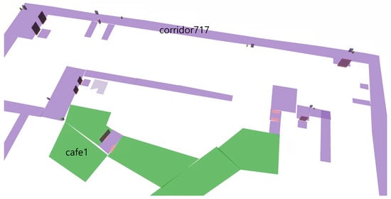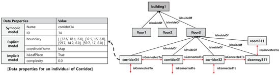 To utilize the environmental information, first, we define data properties for the elements according to the target environment, as described in Table 2. availableStartTime and availableEndTime, respectively, represent a doorway’s open and close time, at the robot can go through; assignedTaskAt is the time when the robot receives a task. Moreover, since the robot should open the elevator to take, we include the canBeOpenedByRobot property that indicates which elevator the robot can enter. isLeafPlace is utilized to represent the lowest hierarchical level of places. In other words, the leaf places do not have any child place represented by the isInsideOf property. The leaf places are the criterion for judging navigability when planning. The properties for size in the explicitModel are defined for determining whether the robot can pass. When passing the doorway while executing tasks, the robot needs to check whether the door inside the doorway is open or not. At this time, the robot selects sensors to check using material knowledge of the door.