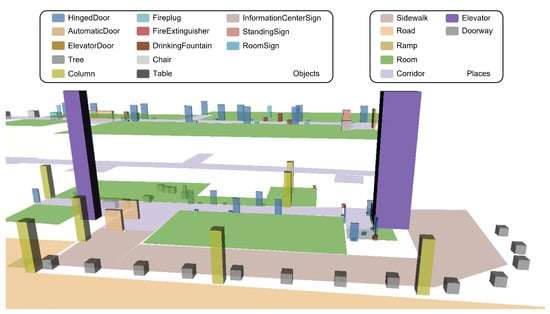 In another research work, Tenorth et al. presented the KnowRob-Map system that combines encyclopedic knowledge with instances of an object in the environment [31]. The object-based map is built using the method in [32] and processed to semantically represent the knowledge based on the system, called KnowRob [33]. The KnowRob-Map system integrates both systems to generate knowledge-linked semantic object maps. The maps are constructed using a triple , consisting of data, ontology, and rules, represented by SWI Prolog [34]. Kunze et al. applied the system to search for objects in large-scale indoor environments [35]. They presented the decision-theoretic search algorithm to maximize the probability of finding the object’s location. Other applications using the system are described in detail in the paper [28].