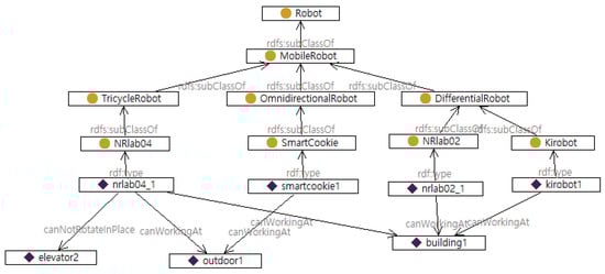 Lastly, we define subclasses of Robot, as illustrated in Figure 4. The subclasses (TricycleRobot, OmnidirectionalRobot, and DifferentialRobot) are distinguished by a robot’s kinematics. We create a robot individual used in our experiments per each subclass: Kirobot, NRlab02, SmartCookie, and NRlab04. Figure 4 describes the asserted properties of each robot (canNotRotateInPlace and canWorkingAt). The individual of NRlab04 can work in building1 and outdoor1, but cannot rotate in elevator2 because of its kinematics. This knowledge can be defined by the following SWRL rule: TricycleRobot(?r) -> canNotRotateInPlace(?r, elevator2). The individuals of Kirobot and NRlab02 can work only indoors, but the individual of SmartCookie can work only outdoors.