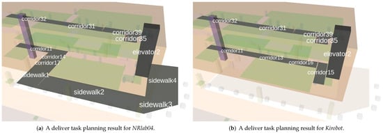 We set the robot’s start and goal as corridor717 on the seventh floor. The robot must stop by cafe1 on the first floor to bring a coffee to complete the task. Therefore, the robot should take the elevator twice. In this scenario, querying for the on-demand database took 232 ms, generating the problem file took 368 ms, and task planning took 73 ms. The behavior sequence had 14 behaviors, and the total sequence duration time was 412 s.