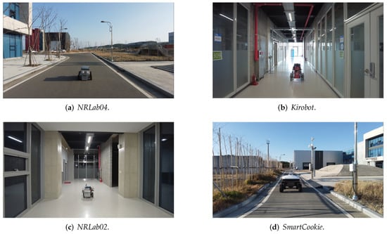 To validate the scalability according to robot types, we used four robots, illustrated in Figure 7. NRlab04 and SmartCookie can work in outdoor1 because they are waterproof; otherwise, Kirobot and NRLab02 can work only indoors, in building1. Moreover, SmartCookie cannot work indoors due to its size. These facts are stored as canWorkingAt in the semantic database.