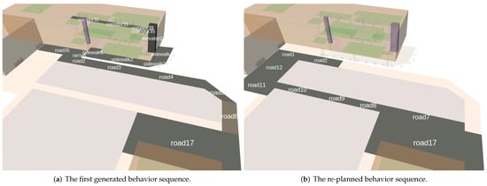 The behavior sequence generated by the task planner. (a) The plan result from corridor32 to road17. (b) The re-plan result from road2 to road17.