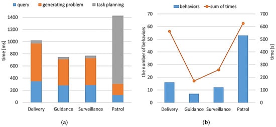 Comparison of four scenarios: delivery, guidance, surveillance, and patrol. (a) Query time for the on-demand database (blue), generating the problem file time (orange), and task planning time (gray). (b) The number of behaviors (blue) and the sum of times for the sequence (orange).