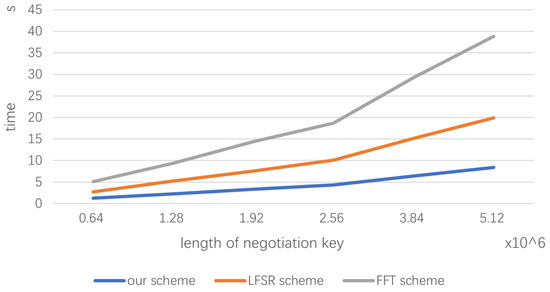 In order to verify the advantages of this scheme, we will compare the key generation rates of different schemes under the same conditions. Firstly, we set several different negotiation key lengths from 0.64 million bits to 5.12 million bits, which is convenient for calculation. The compression ratio N / M is set to 0.1, the length of CA is set to 128 bits, the length of LFSR is the same as that of CA [18], and the size of sub block meets the requirements of each algorithm.