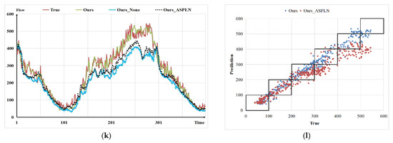 In addition, the ablation experiments results show that models only incorporating one network feature have traffic flow data prediction errors. Among them, the prediction performance of the model that only includes the average shortest node path length is the worst. The average node path length only contains part of the node distance information and has little influence on spatial correlation analysis. Furthermore, the model that only includes the clustering coefficients performed poorly. Since traffic flow is typical non-European structure data, the clustering coefficient cannot fully analyze the spatial characteristics of traffic flow data. Node degree centrality can effectively enhance node-related information and reduce model prediction errors. However, it lacks any analysis of global node correlations. The node degree reflects the node network structure characteristics, and the point strength adds the weight information of the node-related edges to the degree value. Consequently, the node characteristics reflected by the point strength are more accurate and comprehensive than the degree value. The addition of closeness centrality to the model effectively improves the global node correlation analysis, which helps improve the model’s effectiveness. Betweenness centrality can fully represent the node connectivity and the addition of betweenness centrality to the model effectively improves the model prediction effect. In summary, the prediction results of the model combining the six complex network features can accurately fit the changes in real traffic flow data.