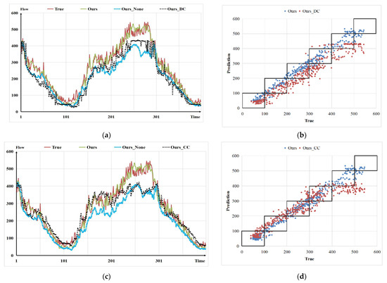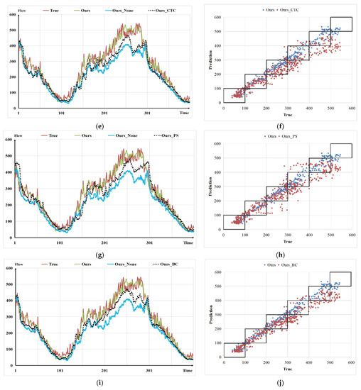 Although point strength can improve the model prediction, it lacks a global traffic network analysis. The Ours_CTC model uses closeness centrality to analyze global node features, and closeness centrality can obtain the node centrality degree based on the network global topology. By incorporating closeness centrality into the model, its analysis of global node correlation can successfully be improved and its effectiveness enhanced. Closeness centrality can reflect the centrality of a node in a complex network but lacks information about interactions between nodes. Betweenness centrality is a global statistic where two disjoint nodes in a network need to pass through other nodes to connect. The higher the number of times a node acts as an “intermediary”, the greater its betweenness centrality. The betweenness centrality can adequately represent the node connectivity and incorporating betweenness centrality in the model can effectively improve its prediction ability. It can be seen from Figure 14 that the model only incorporating betweenness centrality has the best prediction among the six ablation experiments. The model incorporating the six complex network features can fully extract the local and global spatial features in the network and substantially improve the model prediction effect. By analyzing Figure 14, it can be seen that the prediction result of the model incorporating the six complex network features accurately fits the real traffic flow data variation.