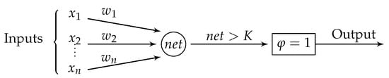 The artificial neuron structure is described by function []. The artificial neuron has n inputs with weights , by which the signal passing through the connection is multiplied. After that, the weighted signals are sent to the adder. The sum of weighted neuron outputs is found as: . This weighted sum is then passed through the activation function , which converts it into a number that is fed to the output neuron. A simple diagram of the operation of a neuron is shown in Figure 1, where the unit-step (Heaviside) function is used as the activation one.
