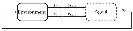 In the concept of reinforcement learning, the notions of agent and environment are used. The agent performs action in the state and receives a reward for this. Depending on the reward value, the agent performs the next action in the state , for which it receives the reward . The agent, in the process of interacting with an uncertain dynamic environment, learns the so-called “optimal decision policy”, which reflects the state of the agent after performing optimal actions [,,]. Schematically, the reinforcement learning procedure is shown in Figure 2.