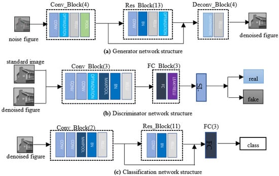 Furthermore, we refer to three loss functions. The first is MSE loss [25]. The values of each pixel of the generated image and the original image are compared, and the mean square error of the generator network is represented by the loss of pixels. The second is GAN loss, which is mainly formed by the discrimination network to determine between the generated denoised image or the original real image [26]. The GAN loss ensures that the generator network generates an image as close to the real image as possible. Then the discriminator network is deceived, to achieve the optimal result of the generated image. The third is classification loss [27]. As the generated image may cause the loss of some features, it is necessary to analyze the generated image category. Then the generator network can generate the same image as the real image, as far as possible.