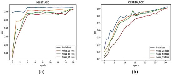 Figure 4b shows the classification accuracy on CIFAR10, which could reach more than 90%. CIFAR10 is a rebuilt data set including RGB images with noise, so that the classification of CIFAR10 was harder. The experimental results showed the experimental error was stable within ±0.1. This shows that the algorithm not only had a significant denoising effect for grayscale images, but also had a strong denoising ability for RGB color images, and it could realize the classification of color images and ensure the recognition accuracy of images. This paper mainly compared the accuracy gap between denoised images and standard images, without excessively pursuing the recognition accuracy of the data set. Therefore, the recognition of the data set did not achieved an optimal effect, which will be the next project.