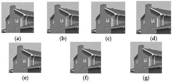It can be seen from Table 1 that the PSNR values of BM3D, DnCNN, FFDNet, IRCNN, UDWT, and LSLA-2 are slightly higher than this paper’s method, when the standard deviation of Gaussian noise , and the difference was almost the same when the standard deviation of Gaussian noise , even being slightly higher than that of some methods. When the standard deviation of Gaussian noise was , the proposed method was significantly higher than the other methods. When the standard deviation of Gaussian noise , the PSNR of the proposed method was about 4 dB higher than the other methods.