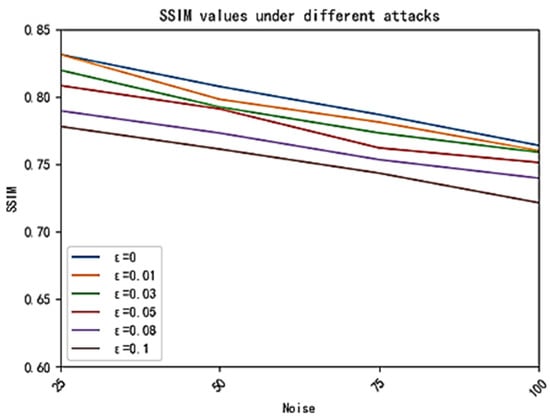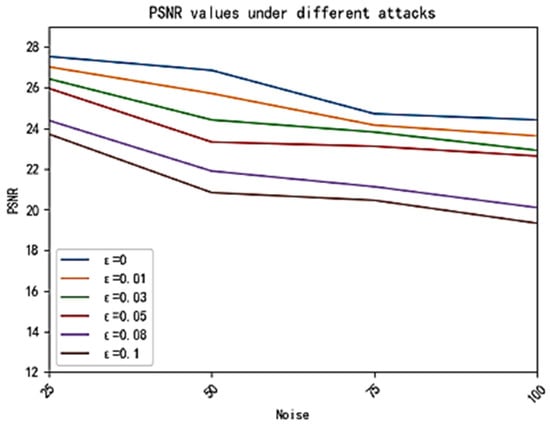 Second, in order to further verify the robustness of this paper’s method for the network, experiments with OA and without OA were performed, to test the defense performance of the model under different disturbance levels of PGD adversarial attack. The PGD attack is an iterative attack, which can be regarded as a copy of FGSM–K-FGSM (K represents the number of iterations). We performed a 10-step PGD adversarial training with a step size of 0.01, to verify the stability of the model under different disturbance levels. The results are shown in Table 4. The defense performance of the network against PGD attack decreased significantly without OA. With the increase of attack amplitude, the SSIM and PSNR values without OA decreased more than those of the network with OA. When adding OA could even improve the SSIM and PSNR values by more than 100%. This proved that adding OA could improve the anti-interference ability and enhance the robustness of the network.
