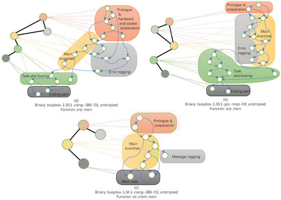 As shown in Figure 1a,c, arp_main() and ssl_client_main() are functions in busybox with the same compiling method. They are functions sharing similar API calls; however, similar calls do not make them similar in function, because the different distribution of nodes makes different function module divisions. In ssl_client_main(), the blocks having register-clearing and stack-recovering instructions are clustered with blocks having API calls to become one new module: main task, instead of two modules in arp_main(): task distributing and ending part, which leads to different subgraphs extracted from the module division result. Therefore, we can use methods such as node clustering to perform function module division for similarity detection. It should be noted that the rules of division are not fully based on functionality; perhaps, some high-dimensional feature is also involved, according to the result after attribute-based clustering.