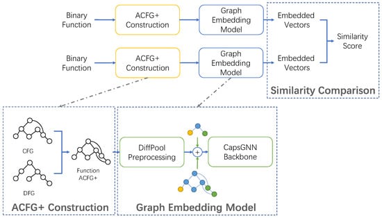To deal with the insufficient characterization of graphs and the neglect of position distribution information in current methods, we propose a graph-based binary function similarity analysis method in 3-step style, which is shown in Figure 2. Firstly, the enhanced Attributed Control Flow Graph (ACFG+) of a function containing more information is constructed, by adding instruction embedding vectors and data dependencies to the ACFG. Secondly, we design a graph embedding model using the Capsule Graph Neural Network (CapsGNN) [] and DiffPool pooling mechanism [], and the ACFG+ is fed into the model to obtain the corresponding embedding vectors. Thirdly, embedding vectors of different binary functions are input into a Siamese network using the cosine distance to calculate the similarity scores between different function ACFG+s.