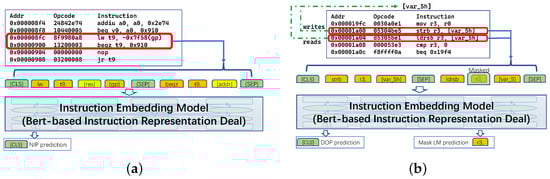 The instruction embedding technique represents every instruction in the same vector space, and the model we used is based on the pre-training model Bert [], which regards the instruction as the sentence and regards the opcodes and operands as the tokens. Pre-training tasks include Next Instruction Prediction (NIP), Instruction Order Prediction (IOP,) and Mask Language Model (MLM). NIP and IOP are modified versions of Next Sentence Prediction (NSP) in Bert, and MLM is similar to that in Natural Language Processing (NLP). NIP cares about the probability that two instructions are connected in sequence; IOP lets the model learn about the sequence of data writing and reading; hence, the control flow information and dataflow dependencies are considered, respectively.
