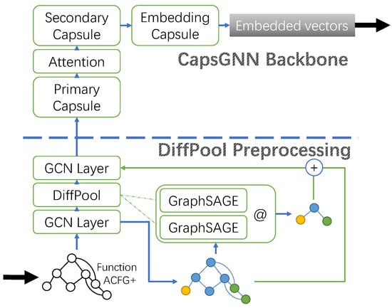 To solve these challenges, a graph-based method in three-step style for binary function similarity analysis is proposed in this paper. To increase the quality of node representation, we first constructed the ACFG+ of a function as the input to a graph embedding model. The ACFG+ is based on the ACFG, adding data dependencies and instruction embedding vectors. To enrich the information contained in the period of graph embedding, we propose a graph embedding model based on the Capsule Graph Neural Network (CapsGNN) []. Capsule transfers and calculates information with more dimensions, and dynamic routing leads the capsule input to the suitable output capsule. The ACFG+ is fed to the model, and it outputs the corresponding embedding vectors. Considering the position distribution for accuracy improvement, we added the DiffPool pooling mechanism [] to the graph embedding model. The DiffPool layer is built on two GraphSAGE [] layers to cluster nodes based on attributes and the position distribution of nodes, generating subgraphs to expand the scale of the graph and represent the position distribution feature.