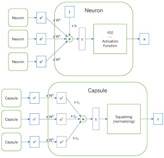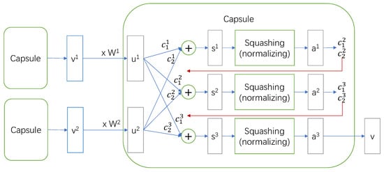 The calculations in a neuron include a weighted sum of outputs from all previous-layer neurons and an activation function operation. Inside the capsule, the calculations contain dynamic routing and squashing, as shown in Figure 5. The dynamic routing mechanism aims at transmitting suitable properties to a suitable place, and different from matrices , , and , which are learned during backward propagation, the coupling coefficients , , and are learned during forward propagation.