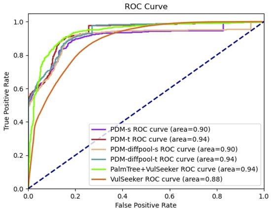 ROC curves and AUC values for VulSeeker, PalmTree + VulSeeker, and four versions of PDM.