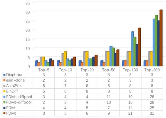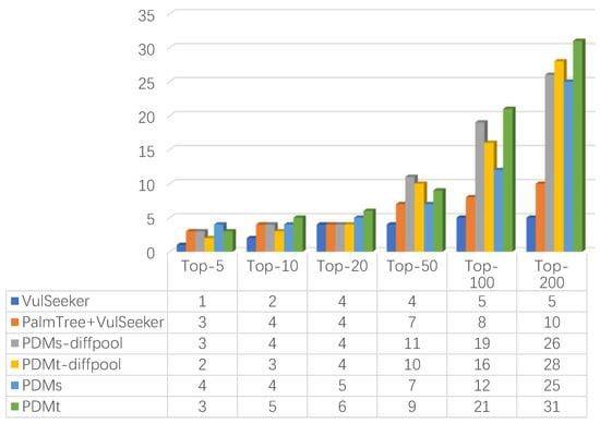 For every CVE function, we ranked the similarity score calculated according to the functions in the other eight programs and counted the number of real CVE functions ranked in the Top-5, Top-10, Top-20, Top-50, Top-100, and Top-200. The statistical results in Figure 8 show that all types of PDM had better performance than VulSeeker and PalmTree + VulSeeker in the Top-5, Top-10, and Top-20 results, showing that enriching graph information and using the position distribution feature are practical. PDM also outperformed other compared methods in the Top-50, Top-100, and Top-200 results, which means having better completeness.