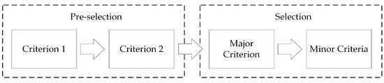 The selection process is structurally divided into two parts, pre-selection and the actual selection (Figure 1 and Figure 2). Pre-selection begins with a filter that excludes non-low-cost sensors from the set of sensors S (Criterion 1). The next step (Criterion 2) answers the question: Does the sensor have a sufficient measuring range to be able to carry out environmental measurements in a given location? This is checked on the basis of a technical literature review.