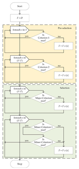 The flow diagram of sensor pre-selection and actual selection. S, set of sensors, F, set of sensors that have not passed all the selection steps so far, , set of sensors that have passed all the selection steps so far.