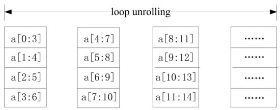 Loop unrolling copies the statements in the loop basic block many times and reduces the number of loop iterations to reduce loop branches and better prefetch data. Among them, the number of copies of the loop body is called the loop expansion factor. Loop unrolling is often used to reduce loop overhead, providing instruction-level parallelism for processors with multiple functional units. However, this transformation may also lead to negative effects on program performance. For example, excessive loop unrolling will cause register spilling, and the register resource will be wasted when the unrolling factor is too small. As a result, the key issue in loop unrolling is the choice of unrolling factor. As shown in Figure 1a, if the unrolling factor is set to 2, the unrolling of the loop is presented in Figure 1b. If the factor is set to 4, as shown in Figure 2, the unrolling technique improves the program performance by executing the same operations parallel. The constraint in the unrolling factor is: