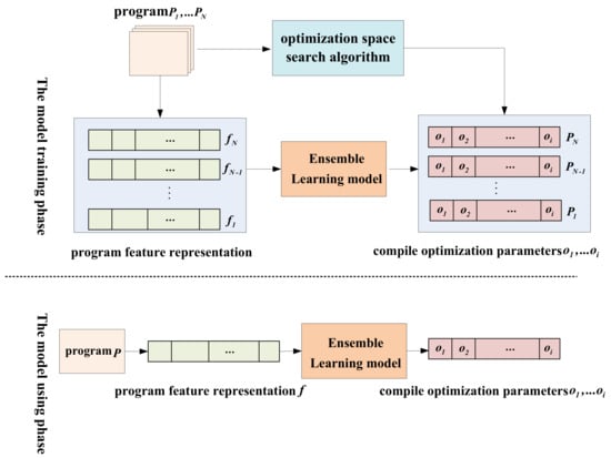Machine learning-based iterative compilation optimization takes advantage of the experience obtained by the previous iteration compilation and constructs the optimization parameter prediction model using machine learning algorithms. The inputs of the prediction model are the features of a program and the outputs are the optimization parameters. For a new program, optimization parameters can be directly predicted by the prediction model. A mechanical search is unnecessary for the optimization parameter space. Most of the existing machine learning-based iterative compilation optimization methods use a genetic algorithm to determine the optimization parameter space, resulting in a long search time and a low efficiency. In addition, the existing methods usually use the static feature representation method to extract the program features. However, dynamic feature representation usually works better to achieve better predictive performance, while we need to run a program at least once to find the dynamic information. There are complex dependencies between the program features and optimization parameters, or between the optimization parameters themselves. Existing methods usually use a separate machine learning algorithm to build prediction models, such as K-nearest neighbor, decision tree, logistic regression, support vector machine, and Bayesian network [21,22,23]. Many theoretical and experimental studies have proven that building a unified classifier through the integration of multiple learners together will make the ensemble classifier prediction more accurate [24].