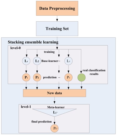 Because BN and NN have the best F1, we separately added the results of these two to the training set for the following prediction. The experimental result is shown in Table 5. From the results, we can see that the prediction performance of the stacking model using the DT + NN results was similar to that of simply using the DT algorithm. The reason may be that the DT prediction accuracy is not high and some data are incorrectly classified into other classes, which influences the correct classification of the model when the wrong results are adjusted into the training data. While the BN results were added to the training data for model prediction, most of the evaluation indices showed quite good improvement. In particular, the F1 score was better than the result of the LR-only prediction, and the time cost was greatly reduced. The reason why adding BN can achieve better performance is that BN uses conditional probability to express the correlation between various information elements, and can learn and reason under limited, incomplete, and uncertain information conditions. Therefore, our ELOPS stacking ensemble prediction model uses the LR + BN model. The experimental results showed that ELOPS can improve the evaluation indicators to a certain degree and had a great performance improvement when compared with the single machine learning algorithm.