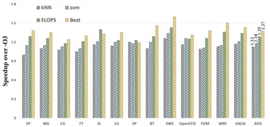 Because the prediction benchmarks in refs. [19] and [21] are different from ours, we used the methods in refs. [19] and [21] to optimize the parameters of the SPEC CPU2006 training set. The results are shown in Table 6, where KNN is the K nearest neighbor algorithm [19], SVM is the support vector machine method [21], ELOPS is the method proposed in this paper, and GCC represents the GCC default heuristics optimization for the optimal parameter selection.