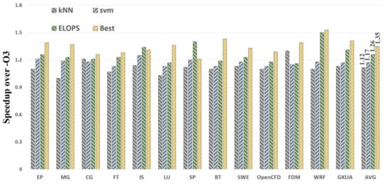 The experimental results showed that our ELOPS had an adequate prediction performance for the new programs. On platform I, the average speedup of the Best and ELOPS was 1.37 and 1.29, respectively, and our ELOPS was up to 94% of the Best. ELOPS had better performances of IS and SP than those of the Best, since one function’s best parameter class does not depend on the others and the AMPSO search will sometimes fall into the local optimal solution. This may also be caused by some noise during data collection. The average speedup of Best on platform II was 1.35, and the average speedup of ELOPS on platform I was 1.26, which is up to 93% of Best. The reasons we performed well in the speedup and the prediction precision are our different feature selection, optimization parameter searching method, and stacking ensemble method. In the KNN model, the author uses static features and GA search algorithms to construct the perdition model. In SVM model, the author uses dynamic features. However, our method used mixed static and dynamic features, which can select the most useful features at the compiling time and the running time for each program. Furthermore, we proposed a new optimization parameter search algorithm better than GA, and we used the stacking ensemble learning prediction model, which are better than the single machine learning algorithms, such as KNN and SVM.