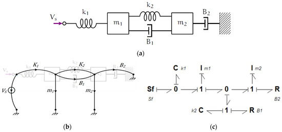 Figure 1. (a) Schematic model of a mass-spring-damper system. (b) Equivalent LG model. (c) Equivalent BG model.