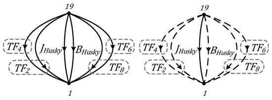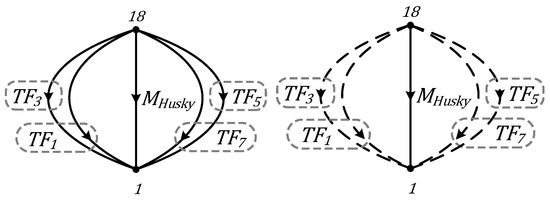 The rotational dynamics of the Husky robot are determined by the summation of the rotational moments produced by the wheels of the vehicle as shown in Figure 9. This is represented in LG form by placing the second ports of the even-numbered transformer elements in parallel with a D-type element ( B H u s k y ) and an A-type element ( J H u s k y ), representing the resistance to rotational movement and the inertia of the Husky vehicle, respectively. This configuration means that the torques produced by each tire will be summed in order to induce a rotation on the vehicle when the wheels produce a non-zero resultant moment and allow the vehicle to remain stationary when the rotational moment is balanced (i.e., the vehicle is not turning).