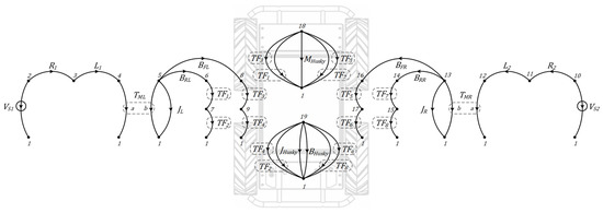 For the expanded model (considering only the drivetrain on the left-hand side of the vehicle here, as the other half of the drivetrain is modeled in the same manner), the second branch of the two-port element (coming from the corresponding motor of the electrical subsystem) splits at its upper node into four paths. The first two of these paths, which are set in parallel with the second port of the motor transformer, consist of elements that represent the parameters of the primary axle of the drivetrain. The first path contains an A-type element ( J R L ), and the second path consists of a D-type element ( B R L ) in series with two transformer elements ( T F 1 and T F 2 ). The first path represents the combined inertial load of the wheel and shaft of the primary axle, whereas the second path collectively represents all of the energy that is lost or transferred out of the drivetrain system. The D-type element represents the energy dissipation from the system due to friction in the shaft bearings and also the friction of the wheels slipping on the driving surface, and the transformer elements represent the transmission of torque from the drivetrain subsystem to the translational and rotational dynamics subsystems of the Husky vehicle. The third and fourth paths consist of a D-type ( B B e l t L ) element and a T-type ( K B e l t L ) element in parallel, representing the compliance and slip of the belt in the pulley transmission system, respectively. These paths then split at their shared second node into two more paths, representing to the inertial load ( J F L ) and the energy dissipation and transmission ( B F L , T F 3 , and T F 4 ) of the secondary axle, similar to the primary axle.
