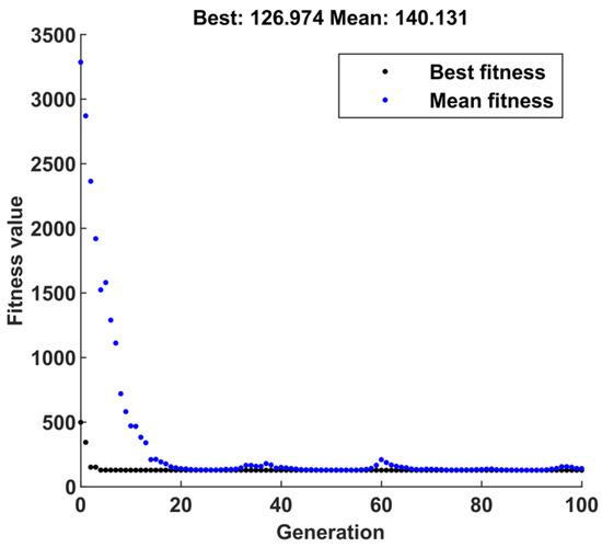 Figure 12 shows the performance of the GA-based parameter estimation procedure. The procedure used to calibrate the model was run with a population of 100 solutions for a maximum of 100 generations and with a crossover fraction of 0.5. Table 2 gives the parameters that are estimated, the upper and lower bounds of their searches, and the results obtained which produced the optimal simulation results.