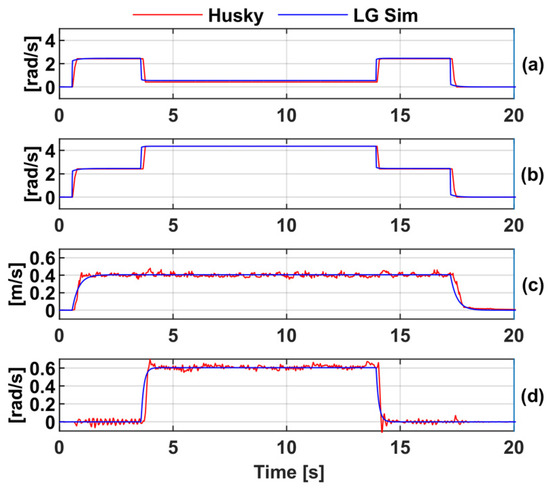 Figure 13. Response of (a) left- and (b) right-side wheel velocities and the (c) linear and (d) rotational velocities of the Husky LG model and the measured Husky data.