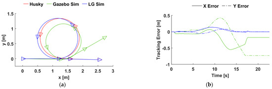 Figure 14. (a) Trajectory and (b) tracking error of the LG and Gazebo simulations and experimental data for the circle maneuver.