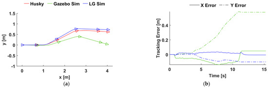 Figure 16. (a) Trajectory and (b) tracking error results of the LG and Gazebo simulations compared with experimental data for the obstacle avoidance maneuver.